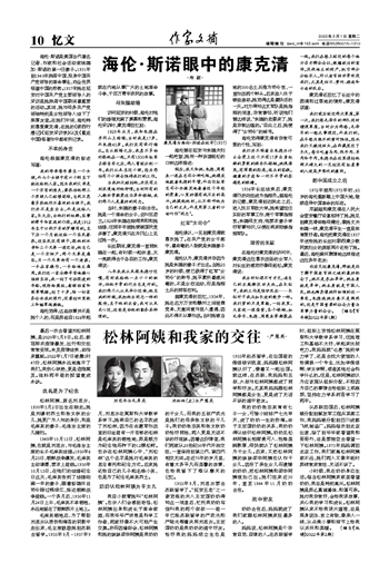 小时候,我在奶奶身边生活。每当松林阿姨来家里看望奶奶,我总是特别高兴。松林阿姨是那么真诚善良、和蔼可亲。她对我非常好,会给我讲故事,关心我的学习和成长。松林阿姨从来不给我讲大道理,总是现身说法、言之有物,像亲人一样,从点滴小事和细节上给我以关怀和温暖。 (摘自《纵横》2022年第2期)