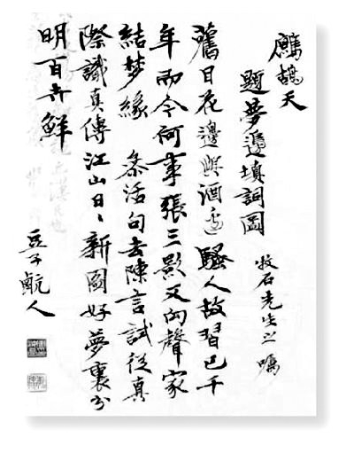 张伯驹先生两次特为张牧石求题“梦边双栖图”,皆因正值张牧石银婚的喜庆日子,父亲虽然目坏,也成人之美,即书下一首“奉题梦边双棲图”的五言绝句。