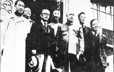 1949年10月3日,张奚若(左三)陪同陈毅视察清华