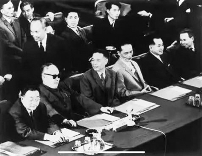 1961年5月,陈毅率中国代表团在日内瓦会议上。左起:章汉夫、陈毅、姬鹏飞等