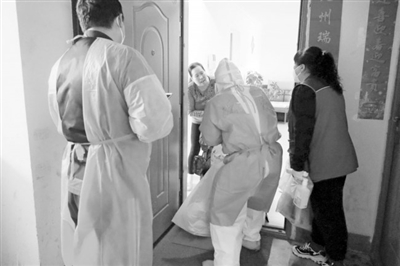 北京社区工作者和核酸检测人员为居民提供上门服务