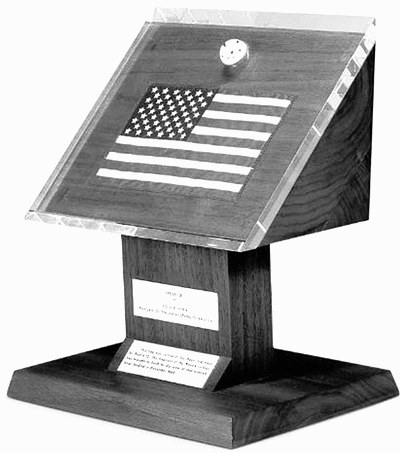 这份礼品由美国得克萨斯州休斯敦载人宇宙飞船中心技术勤务处制作而成,是一个镶嵌月球表面碎片的挂件和一面美国国旗。