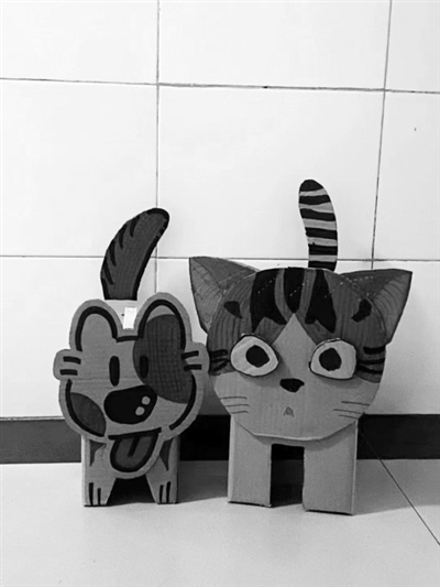 我学的哲学,今年上大二。上大学以来,因为封控,我们多数线上上课。有一天,在我的鼓动下,我们宿舍四个同学开始做起了纸狗。用四五个快递盒子,花了近一个小时,做了一条纸狗和一只纸猫(见左图)。