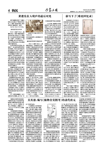 1904年春,黄遵宪患肺病,呼吸困难。临终前他做了一个关于梁启超遭暗杀的噩梦。他还作了一首记述梁启超的诗,在该诗的第二段,黄遵宪略述了一生所经历的重大事件,他希望能活到中国宣告立宪的那一天。然而1905年3月28日黄遵宪病故,享年57岁。 (摘自[美]蒲地典子著 闾小波译《中国的变法:黄遵宪与日本模式》,凤凰出版社2022年7月出版)