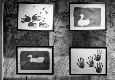 起初说要画画时,73岁的叶金娟奶奶一个劲地摇头,“做不来哟,字都不会写,怎么画画哦”。叶金娟奶奶头发花白,扎着两根麻花辫,笑起来有很明显的酒窝。孙迎盈带奶奶完成了一组蔬果拓印,青椒、土豆、菜心、香菇、柠檬、苹果……拓下的就是她跟奶奶礼尚往来的日常。另一组,是用奶奶的脚掌、手掌、手指完成的(见左图):手掌沾上颜料印在纸上,再添几笔,就成了她养的那只大白鹅,每天威风地带着鸭群在村里游走,被桃野的客人尊称为“带头大哥”。
