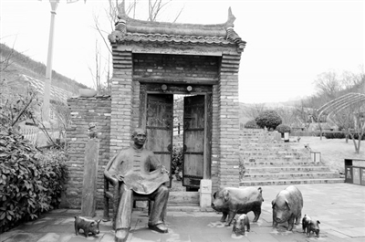 再上几级台阶,又是一个小平台。一个关中地区常见的门楼前,立着一座铜雕坐像(见图2),一个布褂光头的老人似乎在晒太阳,又似乎跟乡间老农正在谝闲传。坐像前面还有大小五头黑猪正在拱食,猪脊背被磨得光亮,应是孩子们骑上去照相所致。近前看说明,所塑者,柳青,写《创业史》写《铜墙铁壁》的大作家!