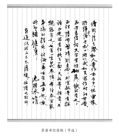 全信字体舒展秀美,清爽悦目(见图)。赵清阁在书信文章中也多次赞誉茅公的书法,如“您的字很像文徵明、倪瓒的,甚清秀”(1975年7月22日信),“且书法精湛、清逸之中显苍劲……钦佩钦佩”(1977年10月21日信),“他的书法清秀飘逸,有赵孟頫的行楷韵味”(1995年《与日月兮同光》)。