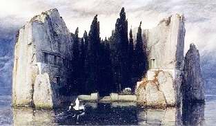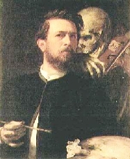 阿诺德·勃克林(Arnold Bocklin,见左图,《与死神的自画像》)1827年生于瑞士巴塞尔的商人家庭,1901年卒于意大利。他早年曾在德国的杜塞尔多夫学习风景绘画。杜塞尔多夫画派是德国古典艺术向浪漫主义过渡的重要画派,勃克林受到严谨的学院派训练,并认识了哲学家费尔巴哈,两人成为好朋友,也因此受到德国哲学的影响。