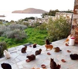 这座面积80多平方公里的小岛位于雅典东南方约150公里的海上,岛上只有2万多名居民,却曾有数千只流浪猫(见右图)。纪录片中记载了一对英国夫妇来到锡罗斯岛度假时,对境遇可怜的猫咪充满同情,于是卖掉了英国的房子,搬到了锡罗斯岛,他们建立猫咪避难所,拯救并收留流浪猫。但坐吃山空以及不断增长的猫的数量还是让他们很快入不敷出并最终破产。好在后来逐渐有些爱猫人士的捐款,慢慢撑起了这家位于海岛上的猫咪收容所。