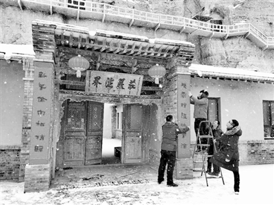 每到汛期,大家就要开始往河边扛沙袋,以防止榆林河的水翻过河堤进入榆林窟。冬天,为了防止雪水融化渗入砂岩、渗到石窟中的壁画上,每次刚下完雪,所有人都要拿上扫帚扫个三四天(见图)。