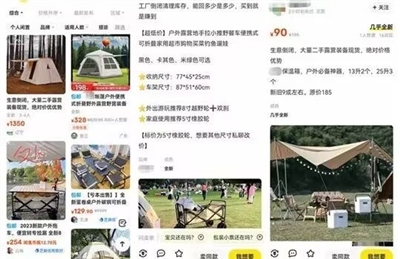 在二手交易平台上,不少卖家声称自己因实体店或工厂倒闭而清仓甩卖帐篷等露营装备(见图)。例如原价389元的黑胶天幕,现在只需要65元。有一位卖家急出几十套全新未拆封的露营天幕,原价198元,现在65元包邮。记者和其交流后得知,他之前一时兴起创业做露营,现在做不下去了。