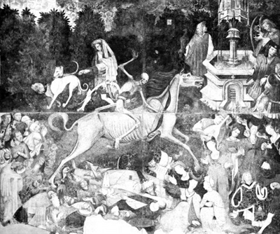 死亡还给艺术家提供了新的灵感,从托斯卡纳到西西里都出现了以“死神胜利”为主题的壁画。最有名的一件在西西里的巴勒莫(见图,绘于15世纪中叶,作者不详),有六米见方,构图考究,笔触微妙,像放大几十倍而不失精确的细密画。画中人物仿佛从《十日谈》里走出来的,齐聚在一个阴翳的花园里,一匹瘦骨嶙峋的马飞跨正中,马背上的死神拉弓放箭,刚射中一名青年,其他如君侯、骑士、诗人和少女纷纷中箭躺下,死相各异;右边几个锦帽貂裘的贵族还在拨弄琴弦,左边一队穷人战战兢兢,徒然地哀求死神手下留情,当中一位却忽然转过头来,与你四目相对。