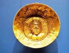 在展览第一单元,“芳香国:多元文化下犍陀罗文明的诞生”主题单元里,一件华丽的酒神金碗(见右图)在入口处格外引人注目。金碗浮雕有四头翼狮与四蕨类叶片,中央头像呈希腊贵族面相,眉骨隆起,双眼圆睁,络腮胡浓密,长发垂肩。依据发上所饰葡萄叶,专家判断其为古希腊神话中的酒神狄俄尼索斯。这件纯金的碗盛满美酒,几百年前使用它的人们,高唱着佛陀乔达摩悉达多的慈悲。
