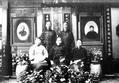 左起,前排:倪秀珍、倪桂珍、倪桂金;后排:倪锡纯、倪嘉树。墙上照片为倪蕴山夫妇