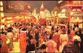 但是每到上元节这几天,不宵禁,因此热闹得不得了(见左图,影视剧照)。大家逮着这个自由的机会去狂欢,男女杂游。据说有的还戴着面具(见右图,影视剧照),就跟狂欢节一模一样。这个上元节还曾经引发唐中宗时期三千宫女大逃亡。