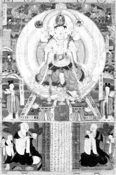 叶昌炽晚年将收藏品出售,两幅绢画归浙江吴兴蒋汝藻的传书堂所有。1925年,蒋汝藻因实业亏损出售藏书,两幅敦煌绢画流入上海书肆主人金颂清处, 1930年被一日本人买走。买画的日本人是谁呢?是山中商会的人。《水月观音像》早在1953年就在美国的出版物中发表了,说明收藏于弗利尔美术馆,《地藏菩萨像》却一直没有踪迹。