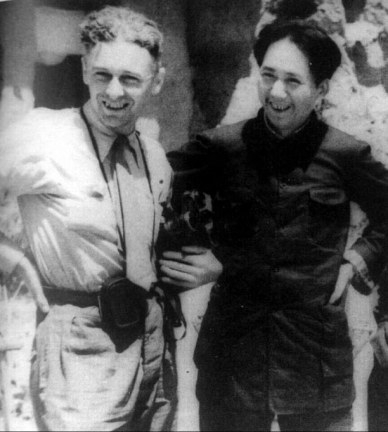 1938年4月,毛泽东与博斯哈德(左)、美国记者阿·斯蒂尔合影