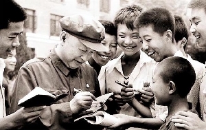 钱学森在全国青少年航空夏令营营地,为青少年签名留念