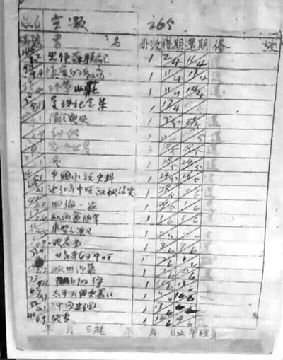 至于宣颐,我猜想他的年龄要大一些。他读的书很杂,也要老气一些。有梁启超的《饮冰室专集(二册)》,也有《美国战争与南北统一》《中国史纲》这样的热门书。他的一个阅读特点是特喜欢差点来息烽集中营做伴的张恨水,连续借阅了《满江红(四册)》《现代青年(二册)》《中原豪侠传》《欢喜冤家》,还有秦瘦鸥的《秋海棠》,而且看的速度很快。《东周列国传(二册)》他借了两次。宣颐对医学感兴趣,可能因为自己就有相关病症,借有《怎样和肺病奋斗》《健康学》《神经病治疗法》《近代病原仿(?)生物学》,他的另一个兴趣点是间谍故事,像《纳粹女间谍》《我是一个女间谍》并不见有他人借阅。