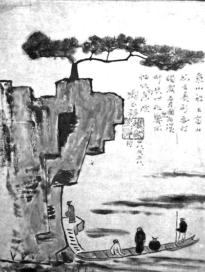 画面是一个人离开停泊在河中小船以及船上的三个同伴和一位撑船人,开始攀登一座山崖,山顶上有一棵硕大的松树。画面的右上款:“伯赞先生”,接着有一首小诗: