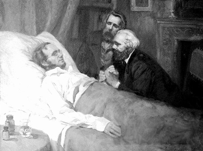 《探望老战友》油画描述的是马克思和恩格斯于1864年5月3日看望病重中的威廉·沃尔弗的情景