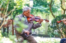 2024年5月7日,上海松江区某街心花园,市民正在演奏音乐