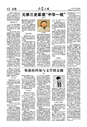 柳宗元比韩愈小5岁,又早死5年,终年47岁。身后没有财产,留下了2个年幼的儿子。柳宗元临终前向刘禹锡和韩愈托孤,因刘禹锡远在连州,柳宗元二子分别交由韩愈和崔群抚育。43年以后,柳宗元的儿子柳告和韩愈的孙子韩绾同榜考中进士。 (摘自《文史天地》2024年第7期)