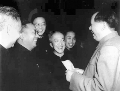 1956年,毛泽东与胡愈之(右三)、费孝通、童第周等交谈