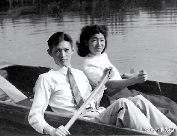 剑桥的中国留学生很少,彼此都很熟悉。一次剑桥中国留学生的聚会上,李林和邹承鲁同台演唱了一首《松花江上》,对音乐的共同爱好渐渐拉近了双方的距离,爱情之窗也悄然打开。那一年剑桥的夏天特别炎热,一天,不想待在实验室的李林约邹承鲁同去剑河划船,结果第二天的当地报纸刊登了报道:头天气温达到了94℉(34.4℃),很多人为避暑到河上划船纳凉,并配图说明。李林一看照片(见图),船上坐一起的那两个神采奕奕的年轻人,可不正是自己和邹承鲁嘛。她赶紧拉着邹承鲁,跑到报社去要了张照片,留作纪念。
