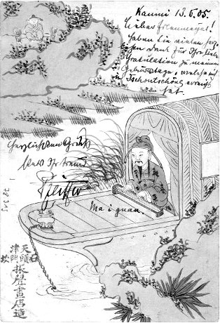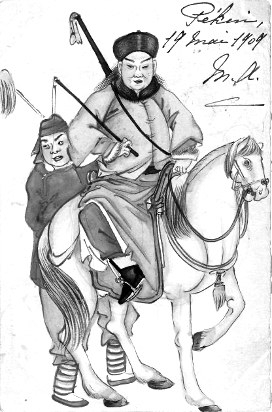 有趣的是,从明信片上的邮票、邮戳信息得知,委托者与画面内容身份吻合,文有荷兰领事馆外交官,武有德国海军军官,显然是向熟悉清廷内情的画工定制的,在其他手绘明信片中,此类题材绝无仅有。