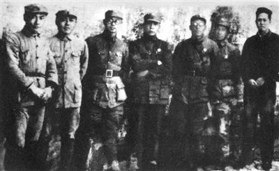 1938年,新四军主要领导人在皖南军部。左起:陈毅、项英、袁国平、李一氓、朱克靖、粟裕、叶挺