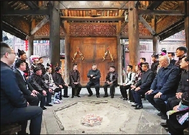 3月17日下午,习近平总书记在贵州省黔东南苗族侗族自治州考察了黎平县肇兴侗寨。在信团鼓楼,习近平总书记同村干部和村民代表围坐在一起,共话乡村全面振兴(见图)。一场别开生面的“板凳座谈会”引人注目。