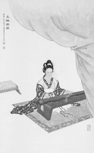 周炼霞擅长仕女人物与花卉,人物师法仇英、唐寅。纵览她的名作《文姬鼓琴》(见右图)《贵妃上马图》《吹箫引凤》《卷帘远眺》,别有一番艺术情趣。颇为别致的是她喜欢画自己,每当构思立意确立后,把自己当成模特,对镜勾勒描绘。故其笔下仕女既有清雅之风,亦具现代之美。