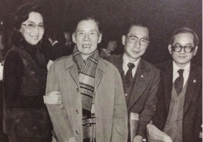 上世纪80年代初,夏衍和朋友们(左一夏梦、右一罗孚、右二为香港摄影家陈复礼)