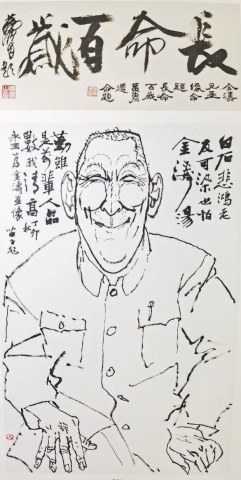 后来黄胄见到这幅画像,连连“点赞”:“不愧为大艺术家,大手笔,永玉画得好,苗子也写得妙!可惜我不在场,‘三黄’缺‘一黄’啊。”刘金涛忙说:“现在也不迟,你题几个字,我自然有办法合为一体。”听刘金涛这么一说,黄胄大笔一挥,写下“长命百岁”四字。