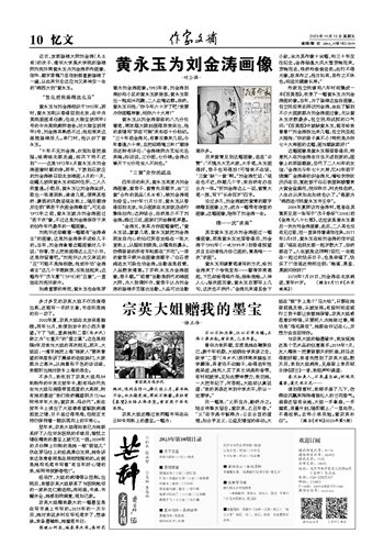 作家包立民曾用八年时间集成一本《百美图》,收录了一幅黄永玉为刘金涛画的像。当年,为了装裱这些自画像,包立民经常去拜访刘金涛,由此了解到不少大画家都为刘金涛画过像,尤以黄永玉次数最多。包立民用试探的口气问:“《百美图》中就缺黄永玉,能否给我看看?”刘金涛找出来几幅,包立民竖起大拇指:“你的面子真不小!特别是为你七十大寿画的这幅,画与题跋都好!”