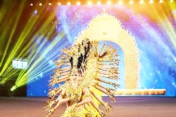 龙年央视春晚,以瓷器为题材的舞剧《唯我青白》选段《瓷影》亮相(见左图),令人惊艳。近年来,舞蹈作品如《唐宫夜宴》《龙门石窟》《千手观音》(见中图),舞剧如《只此青绿》《五星出东方》等,频频出圈,盛誉海外,其背后贯穿着一条共同的创演思路,即文物“活化”。