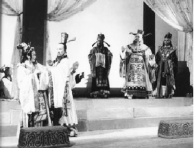 转眼到了四月,话剧《屈原》在国泰剧院首次演出(见右图),董德民夫妇挑着担子,候在国泰剧院门前。“担担面,担担面!”远处传来叫喊声,董德民放下担子回头一看,是阳翰笙同着两位女士朝他走来。董德民连忙热情招呼:“是阳先生啊,吃面?”