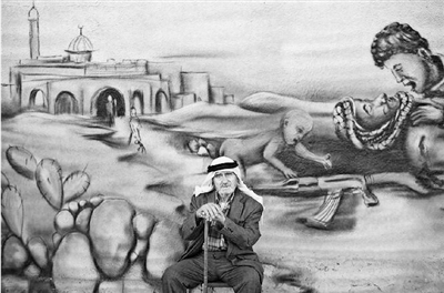 巴勒斯坦街头艺术家莱拉·阿贾维使用流离失所的难民和女性这两重特殊身份进行创作。此外,她还致力于解构性别刻板印象,反映巴勒斯坦难民的困境(见中图,2014年6月,一位老者在耶路撒冷附近的卡兰迪亚难民营的一幅描绘巴以冲突的壁画前),努力引起国际社会对中东弱势群体的关注。