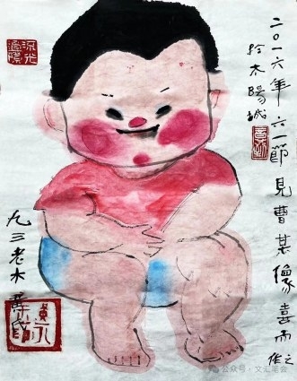 先生93岁那年的儿童节,我在朋友圈晒了一张童年照片,黑蛮哥感到有趣,便与先生分享。先生看后,不觉技痒,很快画了一张漫像(见右图)。画面上如藕一般的大腿和胳膊,再配上一张圆乎乎的脸,脸庞两侧则是两团腮红,煞是可爱,活脱脱一尊无锡惠山泥人玩偶。与此同时,先生还留下一通手札: