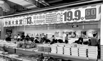如今越来越多超市刮起“食堂风”。7月9日,记者在物美中关村店的便民食堂看到,餐区入口处标着自助餐分两档:一档是13元的碳水自助餐,提供炸酱面、西红柿鸡蛋面等面食;一档是19.9元的自助正餐(见图),包含60多种菜品。