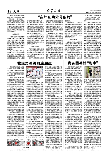 张老师对着长桌比划给我看,周二那天“上书”,整张长桌摆满了,垒起来六七十公分高,几乎到她们肩膀。那几天,刚好杭州城区气温破纪录。离开图书馆,走在曙光路上,闷热中带一丝风。再看见图书馆来往不断的读者,我有了一种不一样的感受。 (摘自7月14日《钱江晚报》 宋浩文)