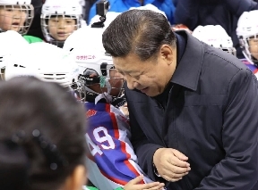 2017年2月24日,习近平总书记在北京五棵松体育中心考察时同青少年冰球爱好者“撞肩”,表示相互问候