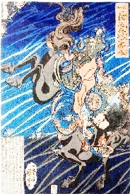 歌川国芳是日本江户时代浮世绘歌川派晚期的大师之一。歌川国芳出身丝绸染坊家庭,起步于创作戏画,其早期作品题材大多来源江户时代盛行的传奇小说和民间传说,内容是英雄好汉,打怪除妖;或者铲恶扶弱。也许正是这种审美主题趣味,他后来的许多作品都与中国历史演义小说《三国志演义》和英雄传奇小说《水浒传》相关。