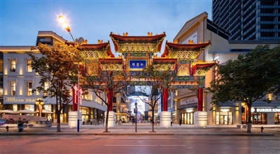 一日傍晚,我与友人相约至此,像是在时光的夹缝中游走,力求在慢生活中寻觅几分意趣。自立冬之后,天地之间万物渐敛,空气中弥漫着清冷的味道,但唐人街里灯火通明、熙熙攘攘,拂去了四处飘散的凉意。身临眼前这个华人文化主题街区,高大醒目的中式牌坊上分别写有“中国城”(见图)“四海一家”等字,柱子上的龙纹雕饰活灵活现,象征着“龙腾中华”“龙的传人”,迎接着四海人家。