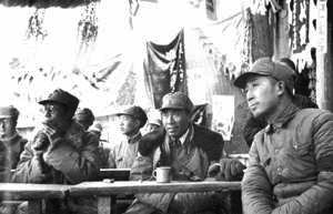 1939年1月3日,右起:薄一波、朱德、董天知与傅钟在山西沁县晋东南地区各界代表大会主席台上