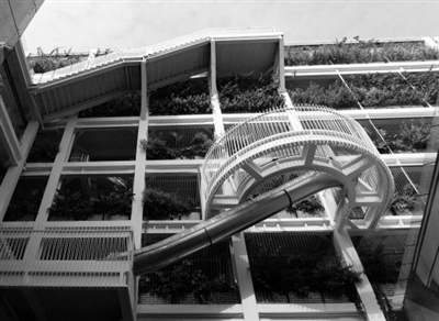 站在院子中间里仰视、环顾,感到包含童趣的同时,处处充满艺术气息,连店铺开业的海报都很别致。原木的架子,浅灰的底色,芦苇、青草、松枝扎成花束形状,两个卡通小姑娘穿着花裙子,每人头上倒扣着一朵紫色的喇叭花,最上方的一行字写着“月野与椿草集”。这里集办公服务、文创体验和日常打卡游玩为一体。每层都有空中连廊和玻璃栈道连接,每层楼都有绿植的枝叶伸展出来,洋溢着蓬勃生机。特别设计的玻璃栈道,让“高空漫步”在办公区就能实现。最神奇的是镶嵌在红色砖墙楼层之间的滑梯,让人可以从顶楼滑到一楼,透明钢化玻璃做成桶状,出口是喇叭口形状的,整体造型像极了一个大大的留声机,盘绕在写字楼里,感觉是工具,但更像是玩具。繁荣生长的绿植和充满童趣的滑梯让这里充满城市记忆和向新生长的气息,这座老建筑被赋予了全新的生命。