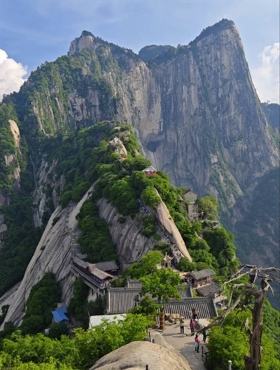 我估看西峰相对高度也就五六十米,葱茏树木簇拥裸露山头。百来米的山脊如同西峰伸出的巨腿,俗称小苍龙岭,约45°坡度,脊背凿坡道,两侧护铁链,游人蹈脊前行。山脊尽头的歇息处,是进出翠云宫和守身崖的集散地。我故地重游,去读崖上石刻:“擢茎天表”描摹西峰山势凌云,“劈山救母”寄寓神话《宝莲灯》;看翠云宫畔危石垒叠,莲花洞顶石叶似莲瓣,“斧劈石”如遭神斧劈开,守身崖下攀登者头足相抵;想二十载风霜催白发,唯青山格外精神。回到翠云宫外小憩,地陪王导30来岁,正在与众人指看南峰,她说:“南峰是华山最高峰,看去虽近,但望山跑死马哩。”