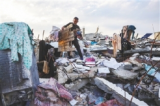 3月4日,一名男子在加沙地带的建筑废墟中捡拾物品