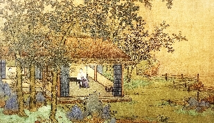 在上海博物馆所藏元代名画中,有一卷题为赵孟頫所绘的《百尺梧桐轩图》(见图)。此图绢本,青绿设色,画的是园居闲适之景。图中一人便服闲坐在精雅的草顶轩堂中;左侧廊中一个披发童子捧茗,堂四周高桐环绕,间以桂树和竹林;右侧水边有一个侍者抱琴而来。全图笔法秀雅,设色工丽,在传世元代绘画中堪称佳作。画后有元代周伯琦、张绅、倪瓒、宇文材、饶介、王蒙、马玉麟七人题诗,都是元末名家。